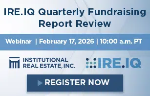 Register Webinar: IRE.IQ Quarterly Fundraising Report Review February 17, 2026 | 10:00 A.M. PT (1:00 P.M. ET) | Zoom Webinar Join Institutional Real Estate, Inc. for the next of our complimentary webinar series, IRE.IQ Quarterly Fundraising Report Review. Content will feature data from our proprietary IRE.IQ database. Loretta Clodfelter, editorial director at Institutional Real Estate, Inc., and two expert speakers will discuss their perspectives on real estate equity and debt fundraising and capital-flows trends for fourth quarter 2025.