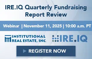 Register Webinar: IRE.IQ Quarterly Fundraising Report Review November 11, 2025 | 10:00 A.M. PT (1:00 P.M. ET) | Zoom Webinar Join Institutional Real Estate, Inc. for the next of our complimentary webinar series, IRE.IQ Quarterly Fundraising Report Review. Content will feature data from our proprietary IRE.IQ database. Loretta Clodfelter, editorial director at Institutional Real Estate, Inc., and two expert speakers will discuss their perspectives on real estate equity and debt fundraising and capital-flows trends for third quarter 2025.