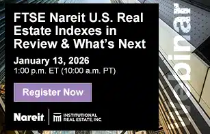 Register Webinar: FTSE Nareit U.S. Real Estate Indexes in Review & What’s Next January 13, 2026 | 1:00 p.m. to 2:00 p.m. ET (10:00 a.m. PT) | Zoom Webinar Join Institutional Real Estate, Inc. and Nareit for a quarterly update offering expert analysis of the FTSE Nareit U.S. Real Estate Index Series. During this one-hour webinar, John Worth, executive vice president of research & investor outreach at Nareit, and Ji Zhang, SVP, portfolio manager, global real estate at Cohen & Steers, will discuss the 2025 Q4 performance and upcoming trends to help you benchmark and analyze exposure.
